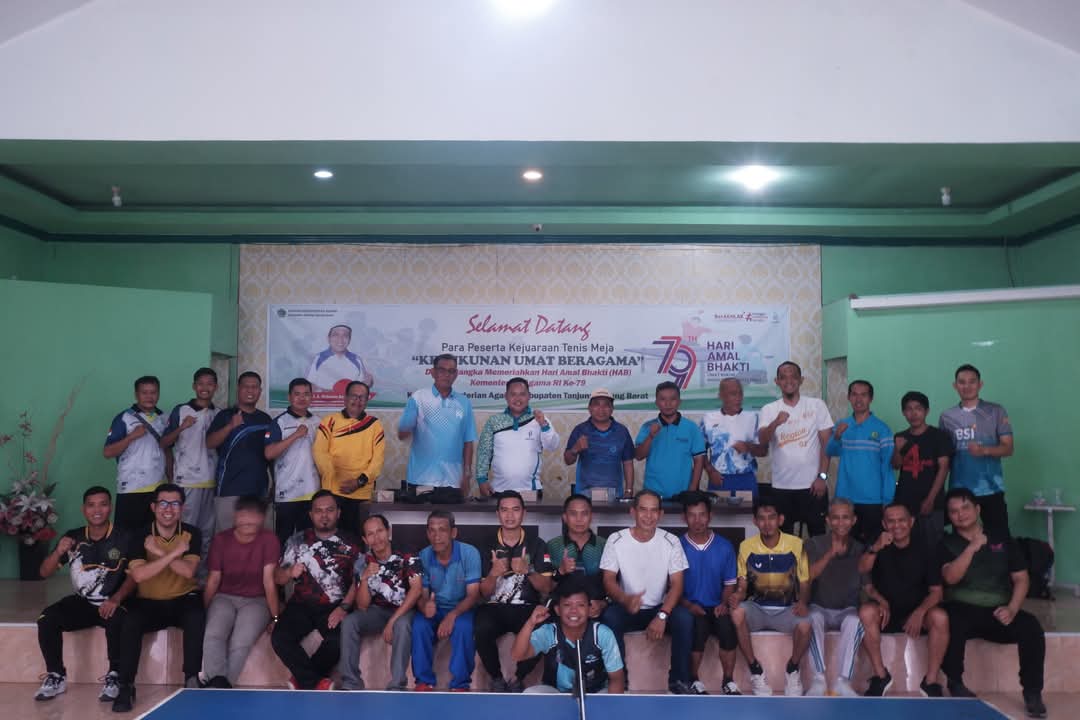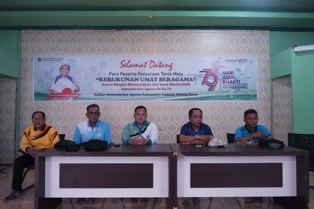 Tanjung Jabung Barat (MTsN 3 Tjb) – Meskipun perayaan HAB Kemenag telah selesai dilaksanakan dengan telah merayakan malam tasyakuran pada Jum’at (03/01/2025), namun kemeriaahannya masih terus berlanjut. Masih dalam rangka memeriahkan Hari Amal Bhakti (HAB) Kementerian Agama RI ke-79 Tahun 2025, Kemenag Tanjab Barat mengadakan Kejuaraan Tenis Meja "Kerukunan Umat Beragama" yang berlangsung pada Jum’at (10/01/2025) di aula Kantor Kemenag Tanjab Barat. Kejuaraan dibuka langsung oleh Kepala Kantor Kemenag Tanjab Barat Dr. H. A. Rahman Sayuti.