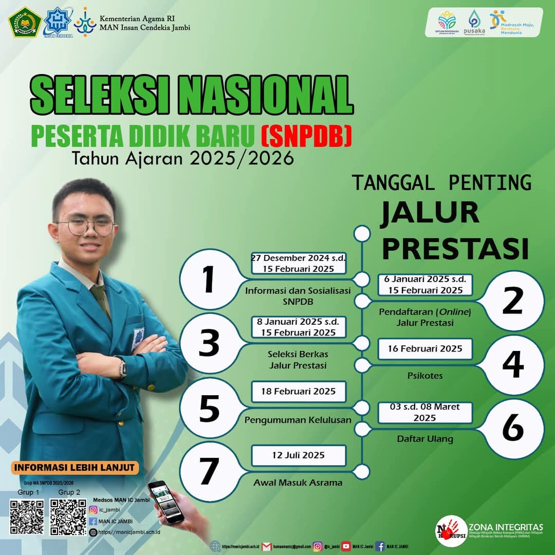 Tidak lama lagi para siswa kelas IX akan menamatkan pendidikannya di tingkat MTs atau SMP. Sebagai langkah persiapan bagi putra-putri terbaik Jambi yang ingin melanjutkan pendidikan di jenjang Aliyah, MAN IC Jambi mengadakan sosialisasi Seleksi Nasional Peserta Didik Baru (SNPDB) Tahun Pelajaran 2025/2026.