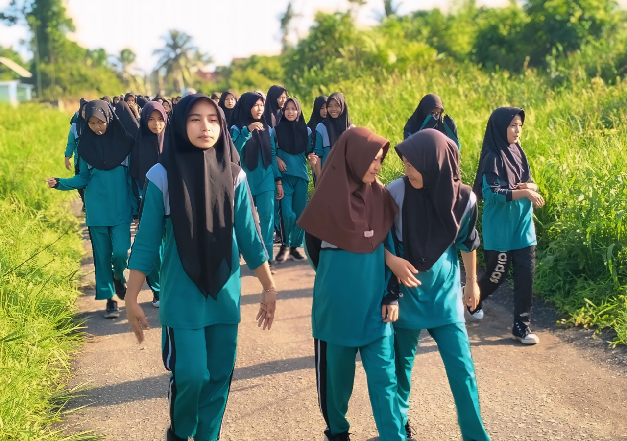 Meskipun cuaca panas pagi ini, namun para siswa sepanjang jalan sangat senang dengan jalan santai, penuh kegembiraan, bergurau sesama teman. Terlihat kecerian dari wajah mereka. Dengan berjalan kaki dapat membuang kelebihan dan membakar kalori. Juga dapat memperkuat otot-otot kaki yang kencang, menyehatkan tubuh dan menyegarkan badan.